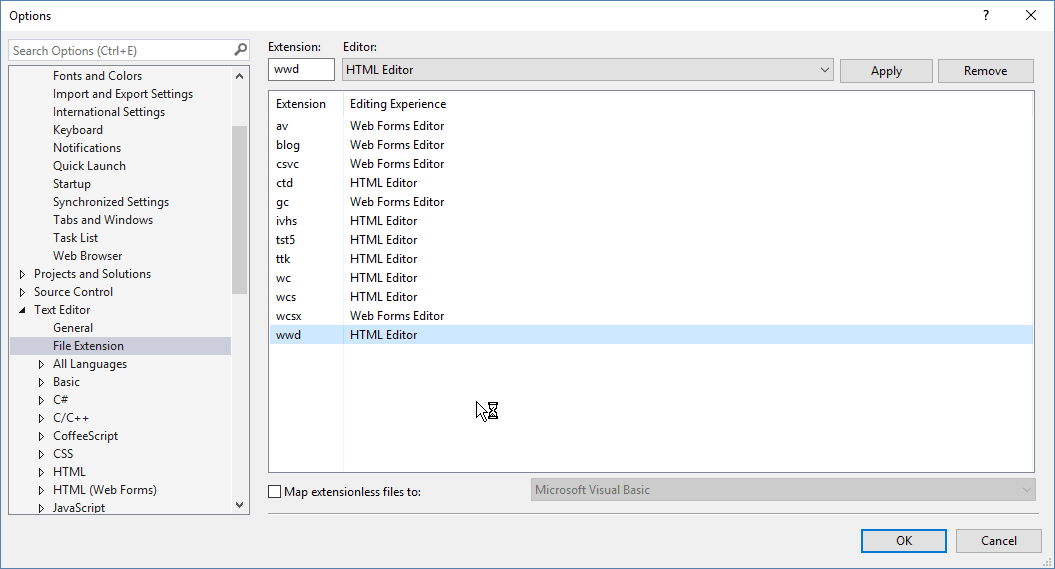 By default Visual Studio only understands certain file types that it knows about. Web Connection tends to use custom file extensions for script files so for example the script map I use for my message board is .wwt for my blog it's .blog. If I open these script files in Visual Studio without mapping extensions, they are displayed as plain text without syntax coloring because Visual Studio has no idea that these files are HTML files.