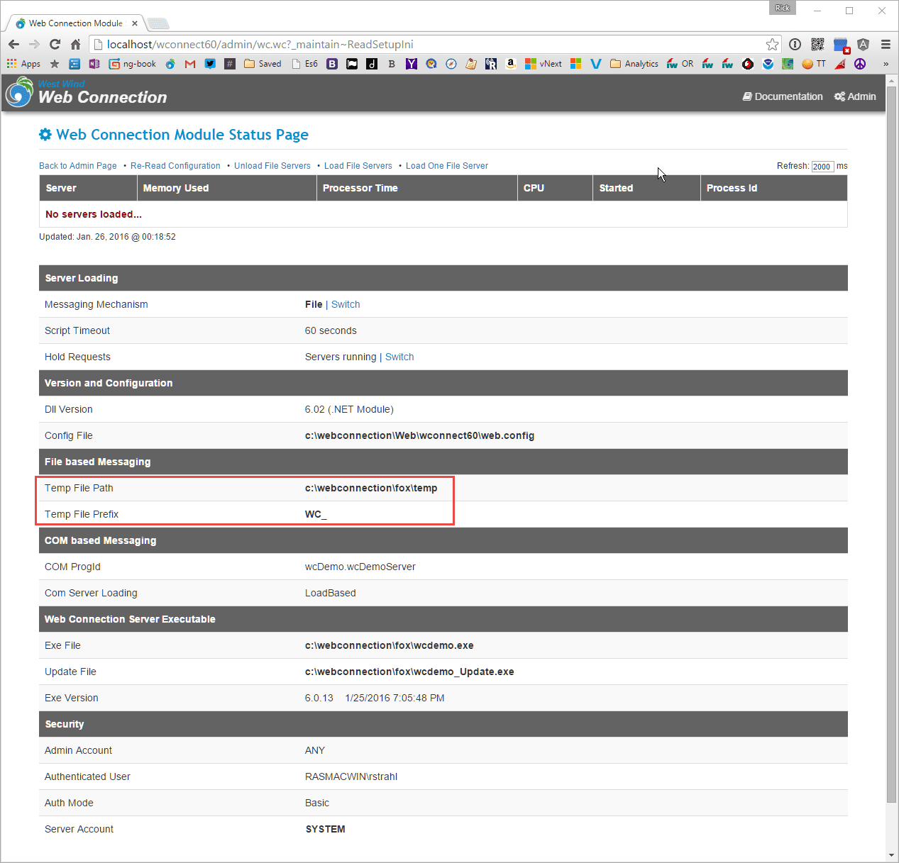 If you are running in COM mode you should hit one of the Admin links on the Admin page that returns the Web Connection Server status. These pages hit the Web Connection server and return various pieces of information from the Web Connection server.