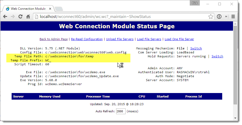 To make changes to the application's INI file simply change the value on the Status form and click the Save Server Settings button. When you exist the form these settings should be live. These settings are written into your application's ini file (<yourApp.ini or wcDemo.ini for the demo app).