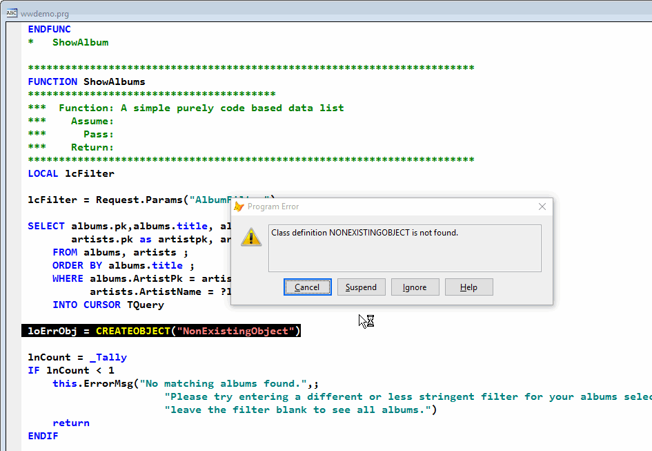 wwDemo.prgwithMODIFY COMMAND samples\wwDemo\wwdemo.wwDemo.prgcontains a samplewwProcessclass calledwwDemowith methods for each of the request links from the Web page.Find the ShowAlbums() method in the class (right click in the editor- Procedure|Function List and find wwDemo.ShowAlbums).