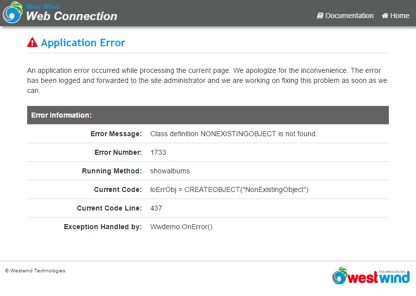 This is obviously much nicer than the server crashing and hanging situation we encountered before. What happens behind the scenes is that the Web Connection error methods kick in and generate this HTML output page.