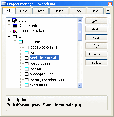 However, while debugging to keep things simpler for running and debugging without an explicit compile step each time I recommend that you actually run the WebDemoMain.prg file instead: