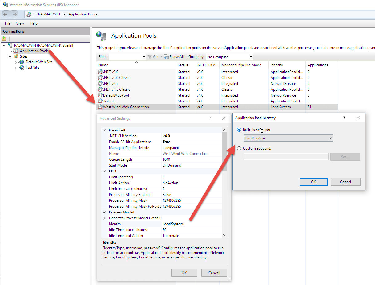 Web Connection defaults to the SYSTEM account when it configures IIS which has full launching rights on the local machine. You can also use NETWORK SERVICE which has more limited rights, but you have to make sure you set permissions on all resources so that that account can read/write as needed. You can also use any other user account you choose, but using other non-Admin accounts will require that you explicitly configure DCOM Config.