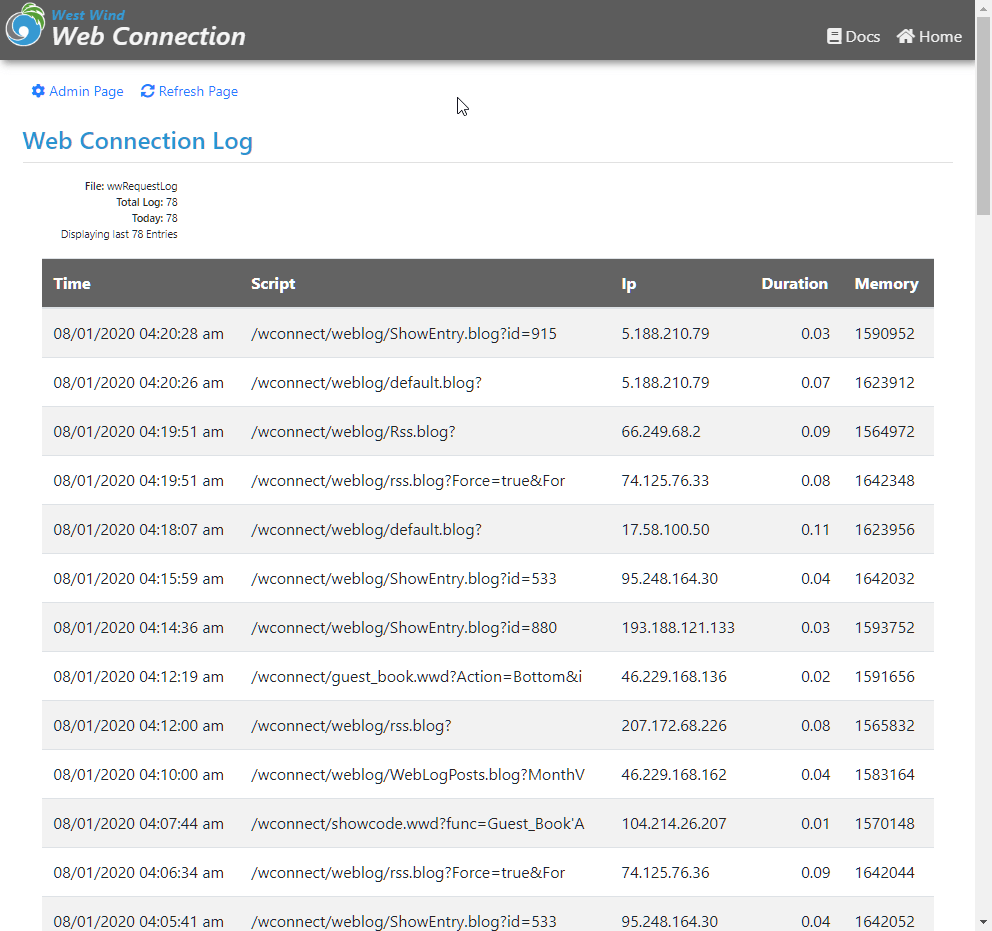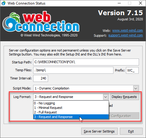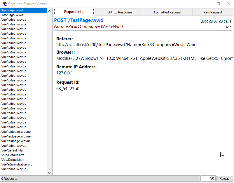 It can be extremely useful to review Web Requests to see exactly what data the client sent or exactly what output the request generated. You can use the Request Browser using the the Display Requests button on the status form. This form shows the last few request and lets you review the request in an easy to use form.