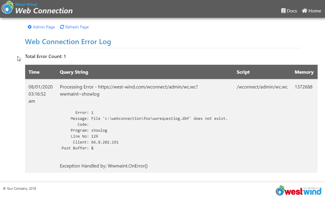 Web Connection includes logging support via a wwRequestLog that can log every request that hits the Web Connection FoxPro server. The logging is managed through the wwServer class and the wwServer::LogRequest() method which is fired at the end of each request. This same logging mechanism is also used to log errors.