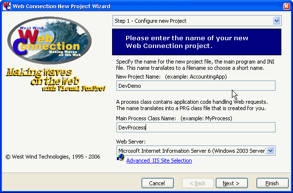 The first step in this walk through is to set up a new Web Connection project. To do so let's start with the Management Console and the New Project Wizard. If you're unfamiliar with Web Connection you might want to quickly review how the NewProcess Wizard works at the link above. Here's the short version.