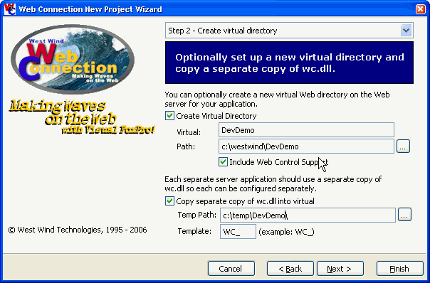 Next create a virtual directory. Notice the checkbox for Web Control Support. When checked this copies some additional files into your Web Directory. A couple of files to configure Visual Studio specifically. Copy a separate copy of wc.dll into this directory so this app is free standing.