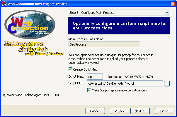 Finally configure a scriptmap for the new Process class. In this case I'll choose .DP (for DevProcess), which will be the extension used for the demos. Note that you can also use the generic .WCSX extension, but using a custom script map allows you to associate a specific Process class with your project, so you can override Application wide settings. Using .WCSX is easier, but using a custom extension gives you more control.